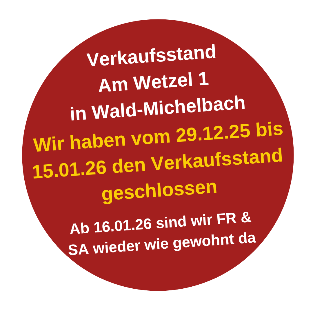 Entdecken Sie unsere Produkte und holen Sie sie bequem an unserem Abholort ab. Besuchen Sie uns an unserem Verkaufsstand in Wald-Michelbach, Am Wetzel 1. Bitte beachten Sie die Öffnungszeiten:
